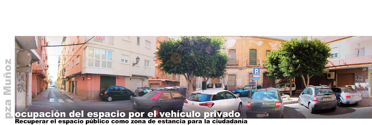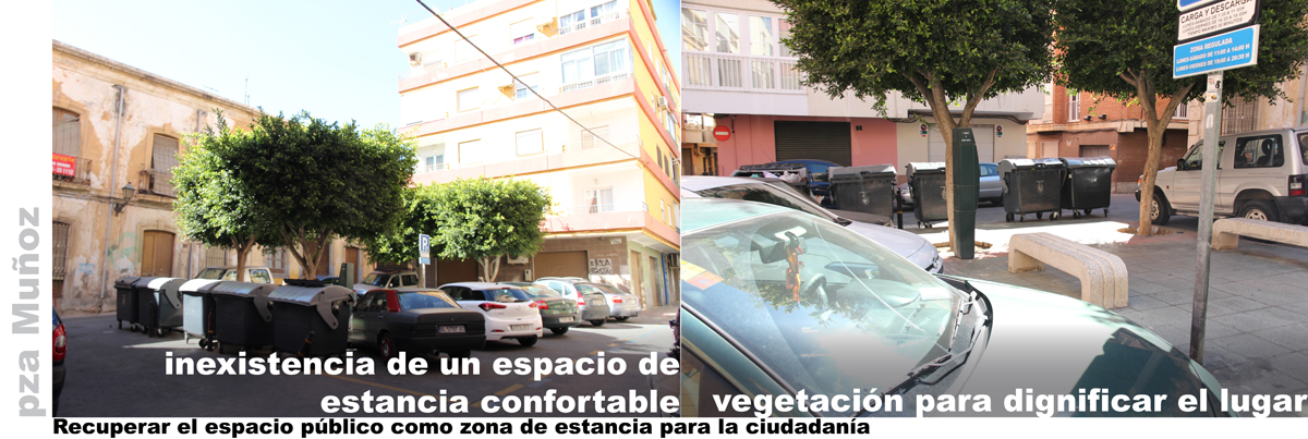 La plaza Muñoz, situada en el corazón del casco histórico de Almería, constituye hoy un ejemplo representativo del espacio público que con el devenir del tiempo ha perdido su carácter peatonal y de lugar de encuentro, para convertirse en una vía de circulación y aparcamiento de vehículos.
