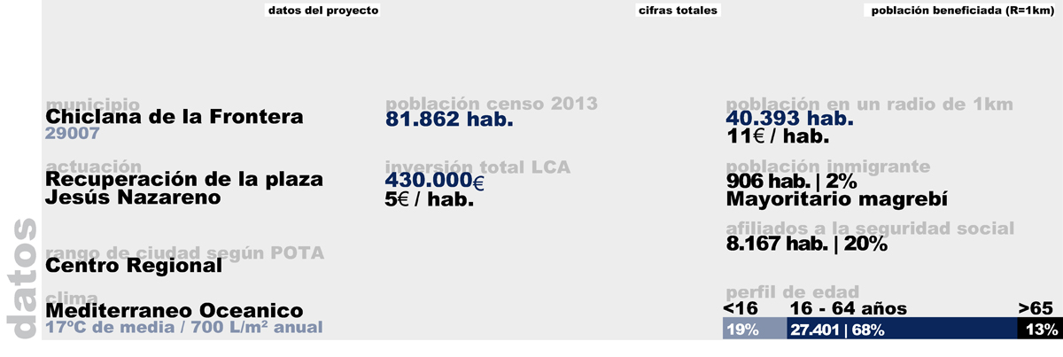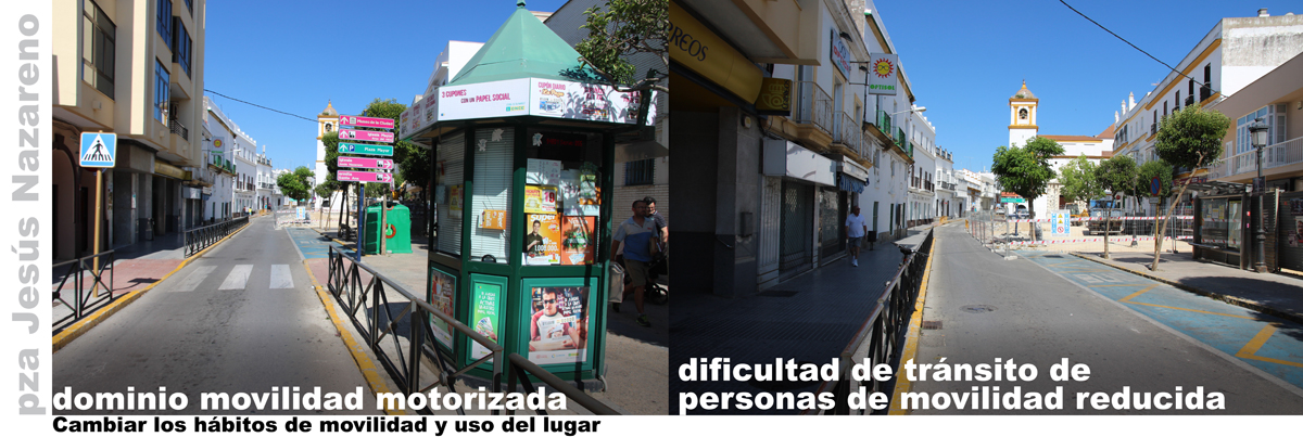 PROCESO. El ámbito de actuación recogido en este proyecto forma parte de uno más amplio, sometido a una propuesta de rediseño de calles, paseos y plazas de la localidad, incluyendo la definición de secciones, características constructivas y calidad de materiales, dentro del trabajo denominado intervención y mejora del diseño urbano de Chiclana de la Frontera, encargado por el Consistorio a un equipo externo. Posteriormente, la actuación sobre la plaza Jesús Nazareno queda incluida en el programa La Ciudad Amable.