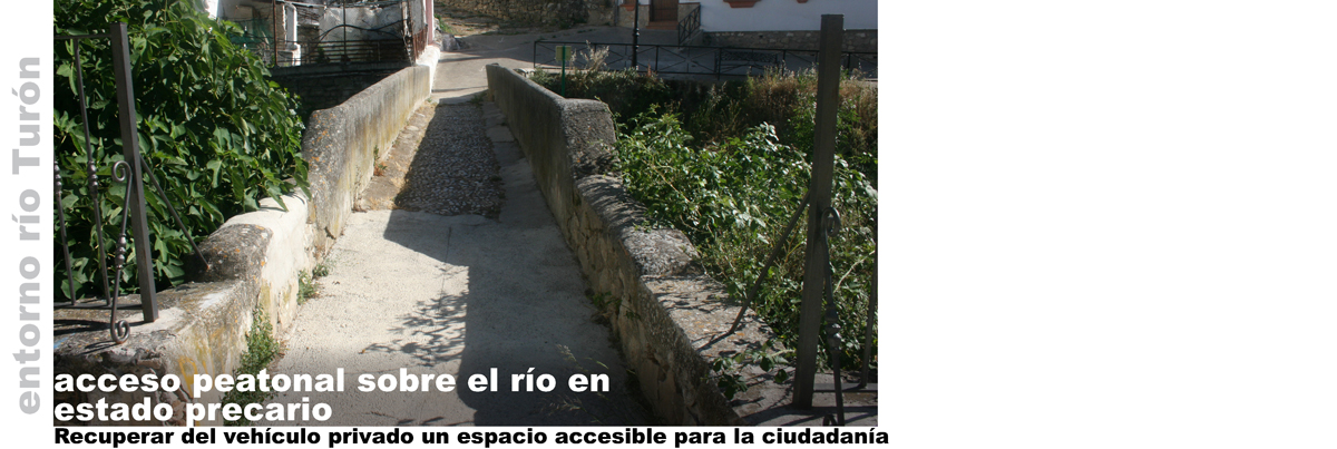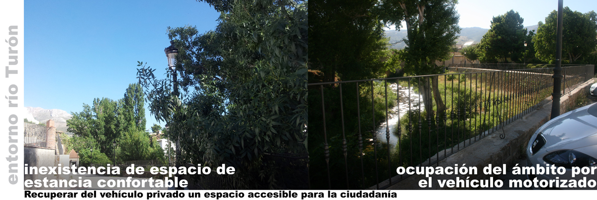 PROCESO. A pesar de constituir una de las fachadas principales del pueblo, el entorno del río Turón no muestra su carácter urbano, conformando más como trasera del núcleo urbano principal, que históricamente se conforma alrededor del bastión del castillo, siendo esta explanada habitualmente utilizada como zona de aparcamiento para el vehículo privado.