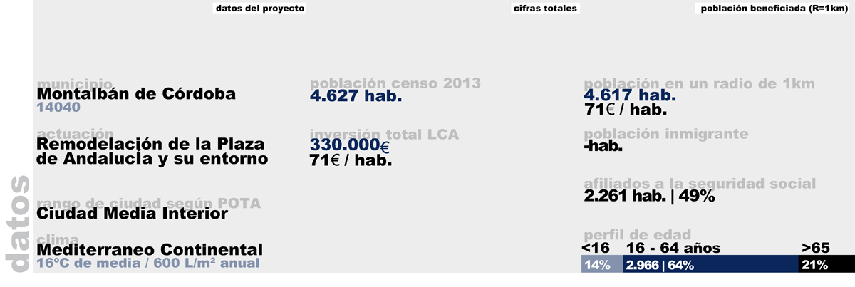 La plaza de Andalucía, ubicada en el centro del núcleo urbano de Montalbán de Córdoba, se inserta en una manzana cuyo diseño es anterior a los años 60, remodelado para albergar a la iglesia Santa María de Gracia, situándose también en este ámbito la sede del ayuntamiento y el teatro municipal.
