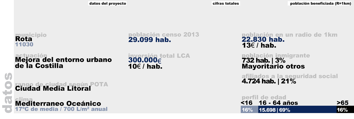 PROCESO. La actuación se ubica en el centro urbano de Rota y, dentro de él, en el centro comercial abierto de la población, en el que constituye uno de sus los ejes comerciales más importantes. El proyecto recoge cómo en los últimos años se ha actuado en el eje de la calle Charco, para abordar ahora, dentro de esta operación de revitalización, el tratamiento del eje comercial principal de la hostelería, el eje comercial de la Costilla.