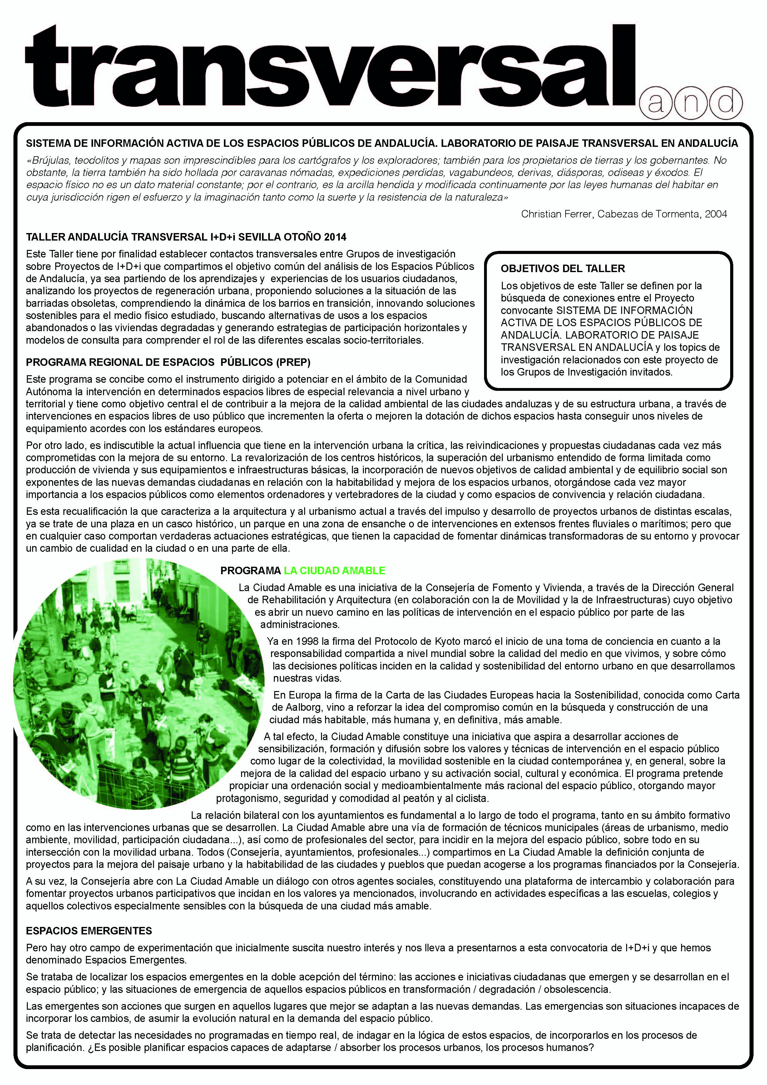 Este Taller, celebrado en el marco de la investigación, tuvo como finalidad establecer contactos transversales entre Grupos de Investigación de Proyectos de I+D+i que compartimos el objetivo común del análisis de los espacios públicos de Andalucía, ya sea partiendo de los aprendizajes y experiencias de los usuarios ciudadanos, analizando los proyectos de regeneración urbana, proponiendo soluciones a la situación de las barriadas obsoletas, comprendiendo la dinámica de los barrios en transición, innovando soluciones sostenibles para el medio físico estudiado, buscando alternativas de usos a los espacios abandonados y las barriadas degradadas y generando estrategias de participación horizontales y modelos de consulta para comprender el rol del espacio público en las diferentes escalas socio-territoriales.