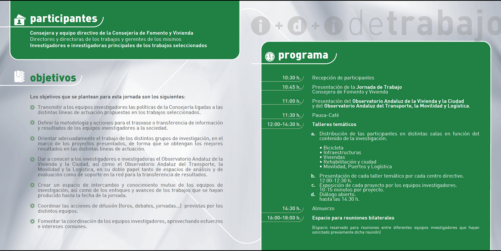 transferencia engloba actividades también dispares, pero cuyo objetivo común es el intercambio de conocimiento entre los agentes. Así, hemos agrupado bajo el epígrafe transferencia: seminarios a los que hemos asistido como ponentes, con el objetivo de divulgar el proyecto; talleres que hemos organizado para trabajar sobre las líneas de investigación en marcha; pero también las reuniones de Control en la Consejería de Fomento y Vivienda y Agencia de Obra Pública de la Junta de Andalucía (AOPJA), sobre el estado de la investigación.